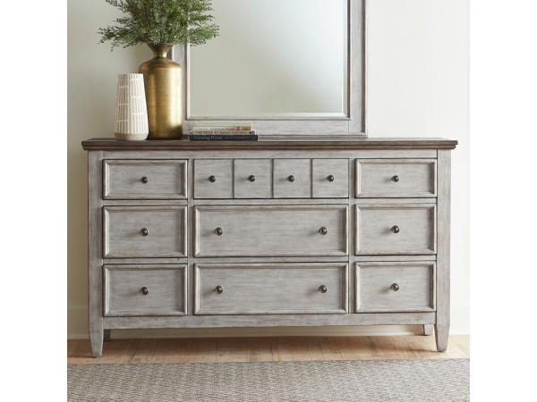 This 9-drawer dresser features an antique white finish with tobacco tops and antique brass hardware, offering a classic cottage style. It provides ample storage with felt-lined top drawers and cedar-lined bottom drawers.