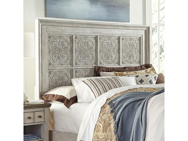 This Heartland King decorative panel headboard features antique ceiling tile panels and heavy picture frame molding. It is made from Rubberwood solids with Cathedral White Oak and Birch veneers, finished in Antique White with Tobacco Tops.