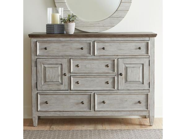 This Heartland 2-door, 6-drawer chesser features a distressed antique white and tobacco top finish on rubberwood solids and oak veneers. It offers optimal storage with felt-lined top drawers, cedar-lined bottom drawers, and antique brass hardware.
