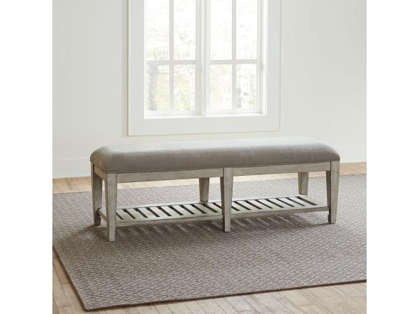 This upholstered bed bench features a gray linen chenille cushion and an antique white finish, bringing a vintage farmhouse feel to any room. It includes a bottom slatted shelf for convenient storage.