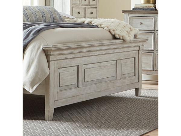 This Heartland King panel footboard features heavy top crown molding, raised panels, and tapered feet. Crafted from Rubberwood solids with Cathedral White Oak and Birch veneers, it has an Antique White finish with Tobacco Tops.