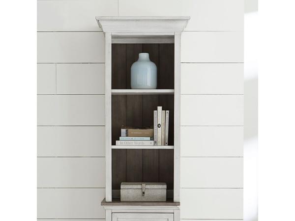 This Ocean Isle right pier top is crafted from rubberwood solids and pine veneers with an antique white and weathered pine finish. It features crown molding, wire management, and two adjustable shelves.