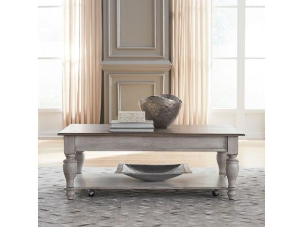 This Ocean Isle rectangular cocktail table adds charm to any living room with its rubberwood solids and pine veneers, antique white finish, and weathered pine top. It features large turned post legs, a bottom shelf for storage, and casters for easy moveme