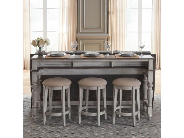 Gather around this Ocean Isle dining table, crafted from rubberwood solids and pine veneers with a two-toned antique white and weathered pine finish. It includes one 18-inch removable leaf and heavily turned legs.
