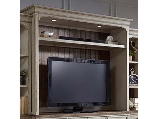 This Morgan Creek Entertainment Hutch, crafted from poplar solids with pine and birch veneers, features an antique white and tobacco finish. It includes a planked back panel, adjustable top shelf, LED touch lighting, and wire management provisions.