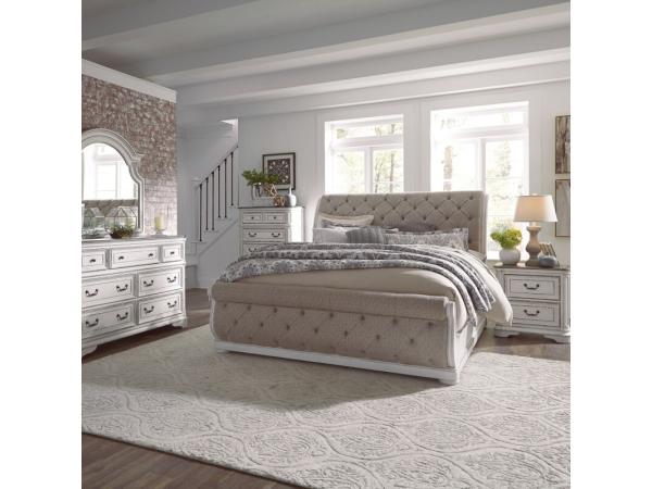 King California Upholstered Sleigh Bed, Dresser & Mirror, Chest