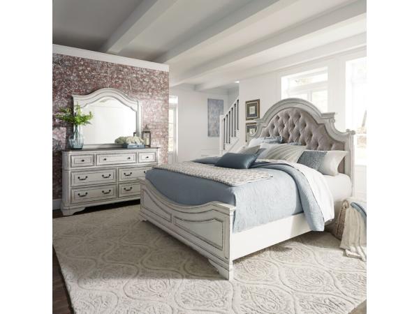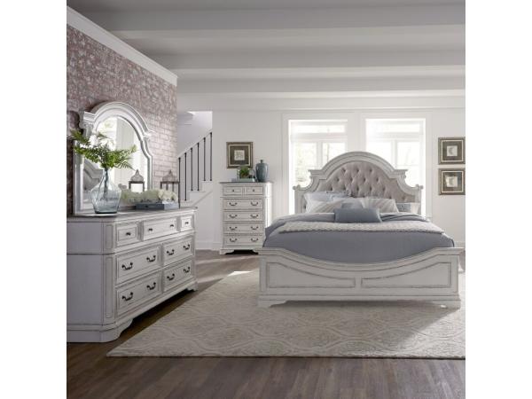 King Uph Bed, Dresser & Mirror, Chest, Night Stand
