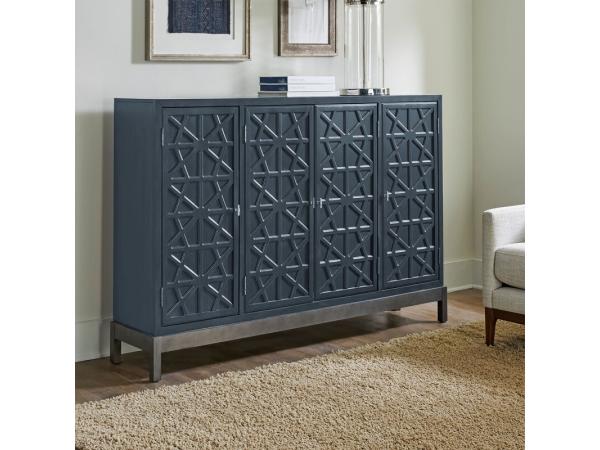 This Braxton accent cabinet, crafted from poplar solids and birch veneers, features a trendy Azure Blue finish. It offers four fretwork design doors with pewter bar pull hardware and three adjustable shelves for versatile storage.