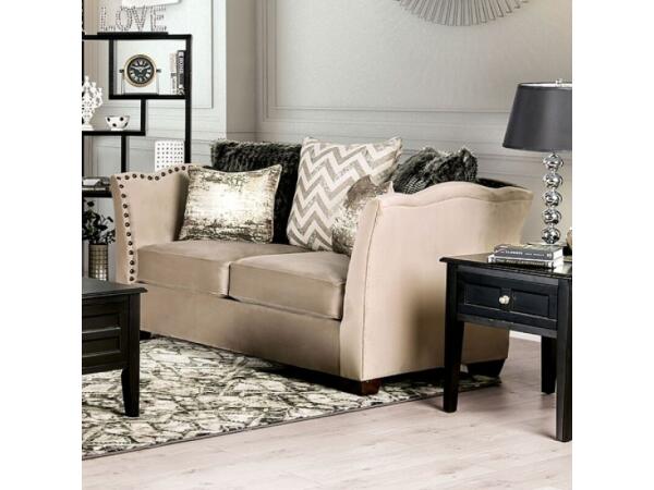 This sofa set is truly unique in its use of camelback armrests. The nailheads dot along the trim and accentuate