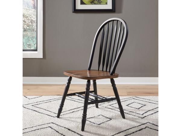 The Carolina Crossing Windsor side chair in black is crafted from rubberwood solids with a two-toned black and honey finish. It features turned splayed legs and nylon glides for floor protection, supporting up to 300 lbs.