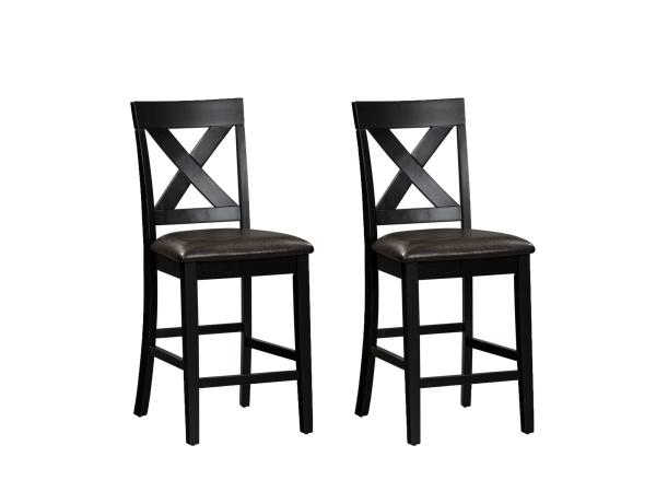 A set of two X-back counter chairs featuring black vinyl upholstery, tapered legs, and a 24.5-inch seat height. Each chair is built to support up to 250 pounds.