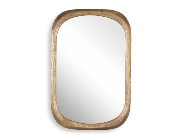 Crafted from cast aluminum and finished in a plated antique brass, the Malone mirror features subtle texture and imperfections for