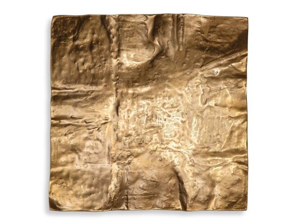 Handcrafted cast aluminum wall accent showcases a heavily textured organic shape in a nickel plated finish. A circular hanger on