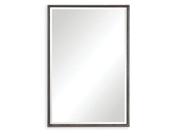 This simple vanity mirror features an iron construction with detailed edges. The slight profile frame is finished in a distressed