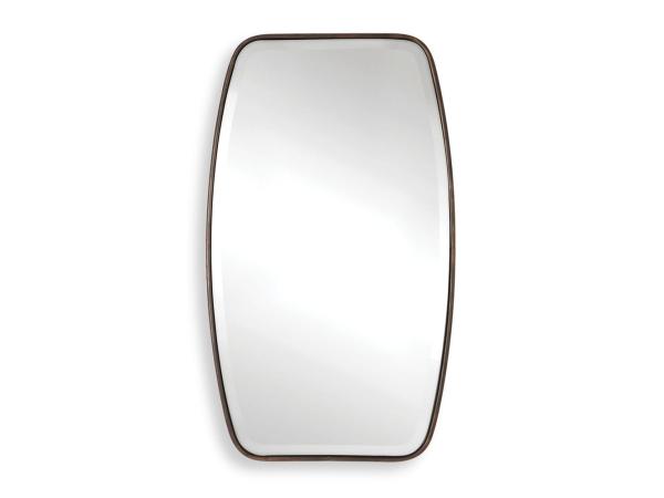 This shaped mirror frame is forged from rounded metal finished in a lightly distressed dark bronze, featuring a floating beveled