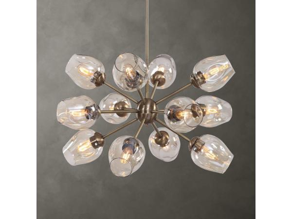 Transitional with a flair of Mid-Century sputnik style, our 12 Lt. rod hung chandelier, features a warm antique brass finish