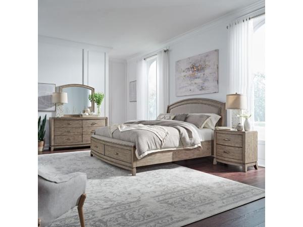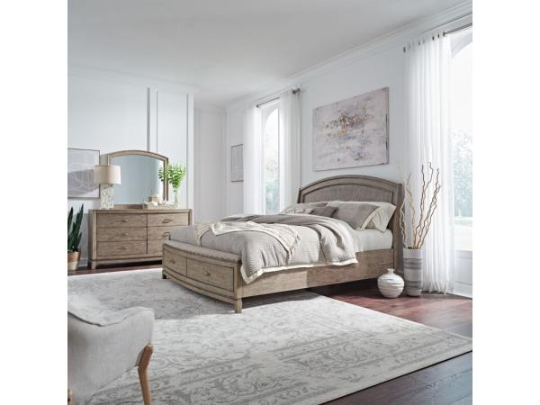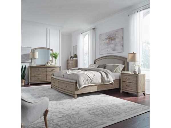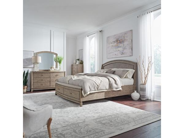 King Storage Footboard w/ Slatroll,King Upholstered Headboard,Storage Bed Rails,6 Drawer Dresser,Arched Mirror,5 Drawer Chest