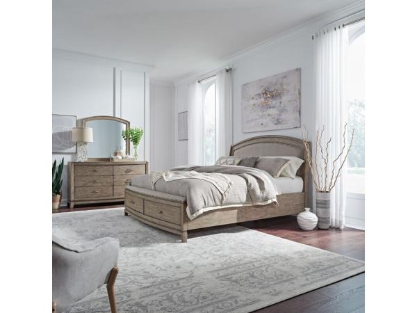King Storage Footboard w/ Slatroll,King Upholstered Headboard,Storage Bed Rails,6 Drawer Dresser,Arched Mirror