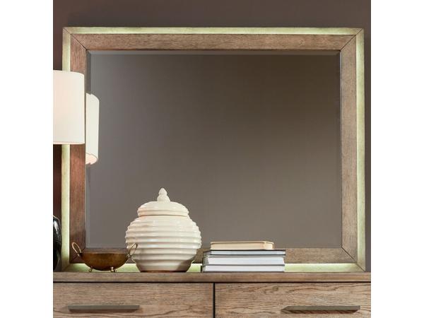 This contemporary mirror features a floating panel design crafted from rubberwood solids and white oak veneers in a burnished beige finish. It includes inset warm LED three-way touch lighting and a beveled edge.