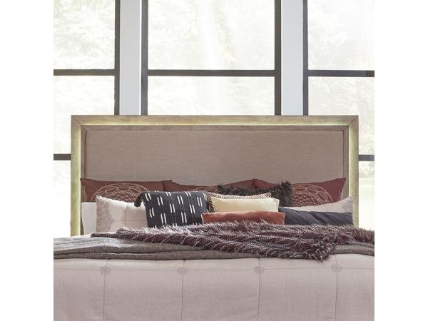 This Queen upholstered panel headboard features lights and a burnished beige finish, crafted from rubberwood solids with reverse split heart oak veneers. It can stand alone or pair with rails and a footboard for a complete bed.