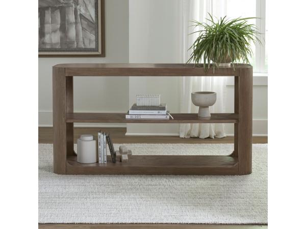 This sofa table features a faux concrete top insert and rounded wide legs for a modern look. It includes one adjustable wood shelf and an open bottom shelf for versatile storage and display.
