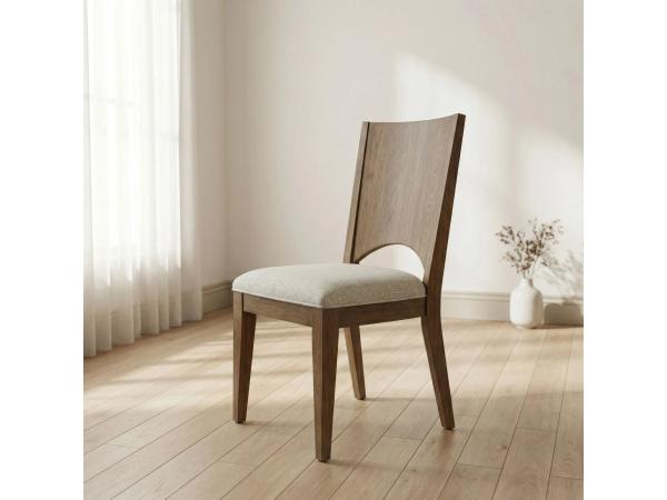 This Upholstered Side Chair features textured gravel upholstery, sloped arms, and a barrel back design. It is supported by tapered legs and includes nylon chair glides.