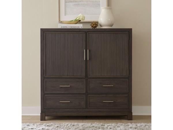 This modern dressing chest features a Caffe finish on Rubberwood solids and Melamine, with wide picture frame molding and a raised block base. It includes two reeded doors with an adjustable shelf and four wood-framed drawers, all accented with Satin Wash