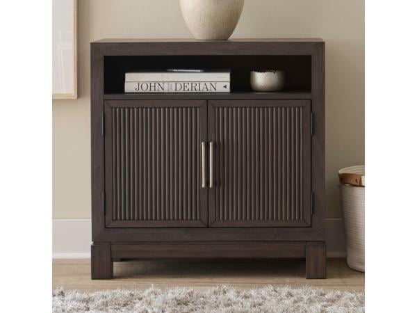 This modern bedside chest, crafted from Rubberwood solids and Melamine with a Caffe finish, features wide picture frame molding and a raised block base. It offers two reeded doors with an adjustable shelf, an open storage compartment, and a built-in USB-A