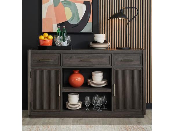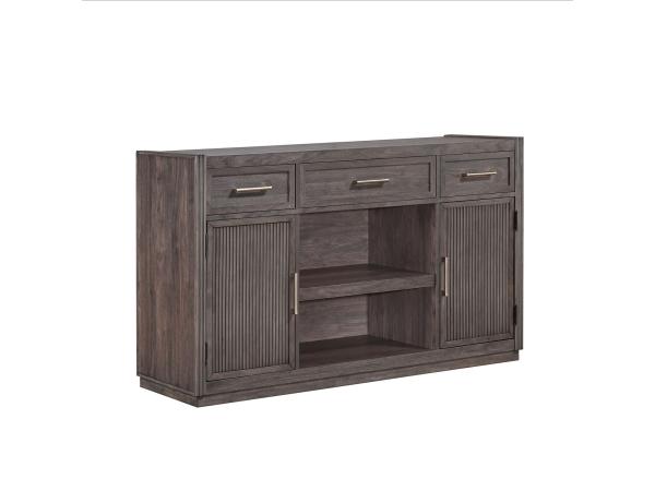 This versatile server features raised reeded end panels and a plinth style base for a cohesive look. It provides ample storage with three drawers, two doors with internal shelving, and an open display shelf.