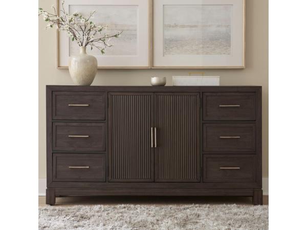 This modern dresser, crafted from Rubberwood solids and Melamine with a Caffe finish, features wide picture frame molding and a raised block base. It provides ample storage with two reeded doors, an adjustable shelf, and six wood-framed drawers with Satin