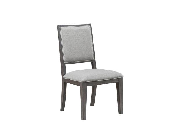 This wood-framed side chair features textured gray upholstery and a comfortably padded seat and back. It is supported by square tapered legs with nylon glides to protect your flooring.