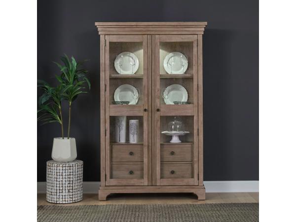 This display cabinet illuminates your collectibles with touch LED lighting behind two wood-framed seeded glass doors. It features two adjustable glass shelves and two interior storage drawers with premium felt lining for versatile display and organization