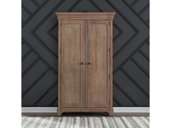 This armoire offers versatile storage with two wood-framed doors that open to reveal two adjustable shelves and two internal drawers. Its traditional design is characterized by a heavy step crown and reeded center mullions.