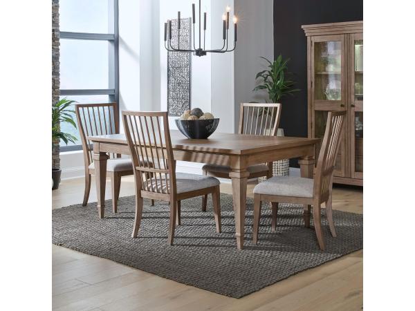 This 5-piece dining set comes with a rectangular leg table and four spindle back side chairs. The table is equipped with an 18-inch self-storing leaf on a metal gear track system for easy extension.