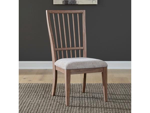 This spindle back side chair features a classic design with modern updates, including a padded seat with textured sand upholstery for comfort. It is supported by square tapered legs and has a shaped back frame.