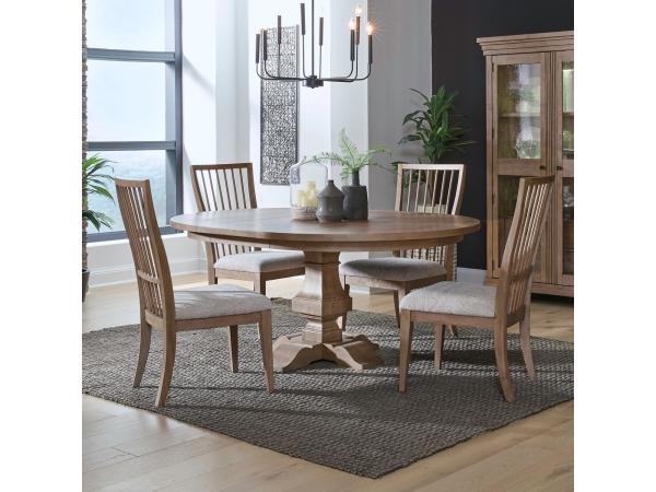 This 5-piece dining set features a classic pedestal table with an 18-inch removable leaf. It includes four side chairs with softly shaped backs and padded seats upholstered in a textured sand fabric.