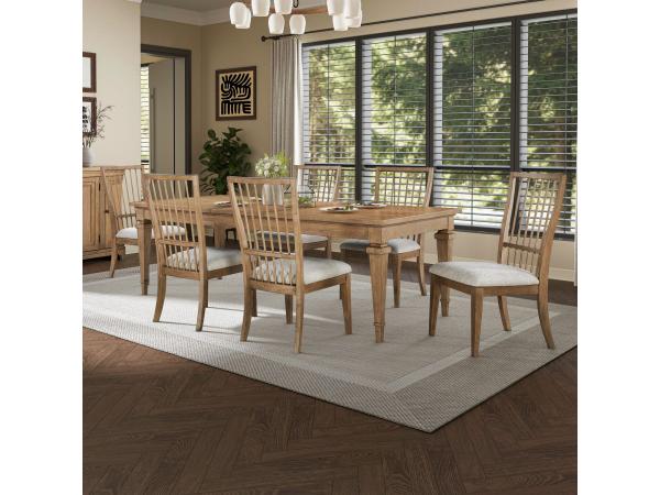 This 7-piece rectangular dining set includes a leg table and six spindle back side chairs. The table features an 18-inch self-storing leaf, making it easy to expand your dining space when needed.