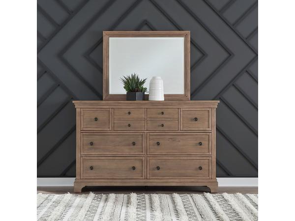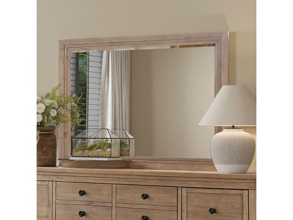 This landscape mirror features a one-inch beveled edge and is framed with picture frame and graduated step molding for a sophisticated look. It includes bolt-on supports for easy attachment to a dresser.