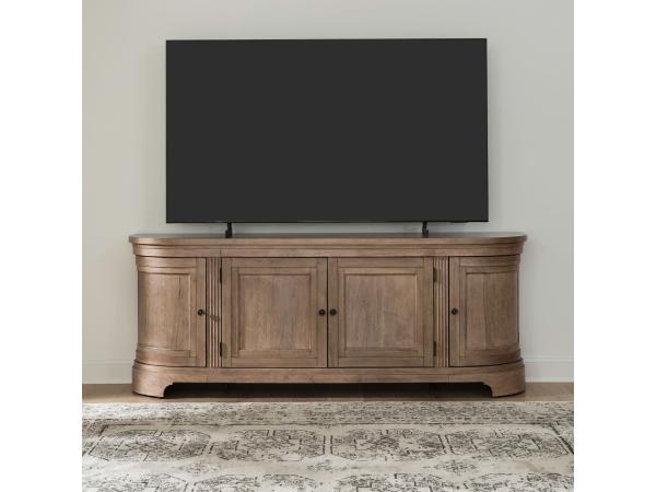 This 82-inch TV console offers ample storage with two wood-framed center doors and curved side doors on each end. It features adjustable wood shelves and is detailed with burnished brass knob hardware.