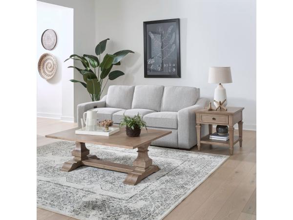 This 3-piece occasional table set includes one rectangular cocktail table and two end tables. The design features column-style double pedestals, a storage drawer, and an open bottom shelf for display.