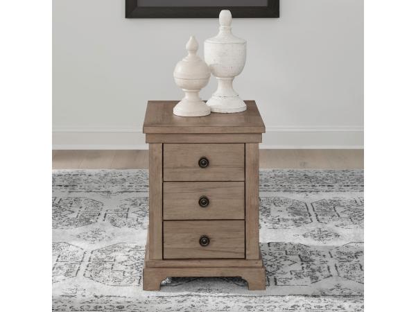This chairside table provides ample storage with three drawers featuring burnished brass knob hardware. The design is finished with a step base molding and shaped bracket feet.
