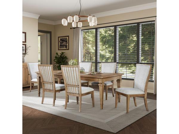 This 7-piece rectangular dining set comes with a leg table and six side chairs featuring textured sand upholstery. The table includes an 18-inch self-storing leaf for added versatility.