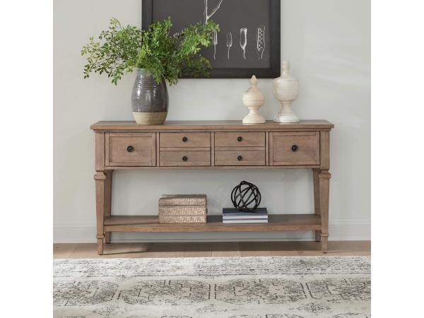 This sofa table combines ample storage and classic style, offering four drawers and a large open bottom shelf. It is designed with square turned legs and burnished brass hardware for an heirloom appeal.