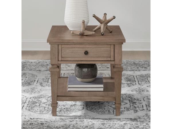 This functional end table offers storage with one drawer and an open bottom shelf. It features classic square turned legs and is accented with burnished brass knob hardware.