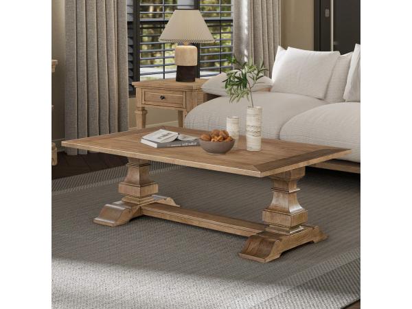 This rectangular cocktail table stands on distinctive column-style double pedestals connected by a center trestle. Oversized shaped bracket feet complete the sturdy, traditional design.