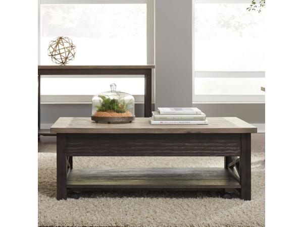 The Heatherbrook lift top cocktail table is crafted from poplar solids and acacia veneers with a charcoal and ash finish. It features a top that extends to 27", a bottom shelf for storage, open grid end panels, and casters for easy mobility.