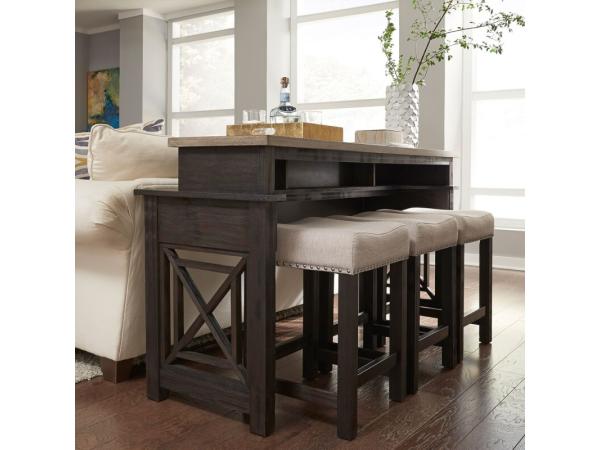 The Heatherbrook console bar table, crafted from poplar solids and acacia veneers with a charcoal and ash finish, includes two electrical outlets and USB ports for charging. It also features open grid end panels and a block leg design, fitting well behind