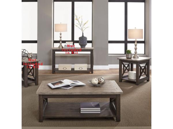 The Heatherbrook end table features poplar solids and acacia veneers with a charcoal and ash finish and two-tone top. It includes a bottom shelf for storage, open grid end panels, and a block leg design.