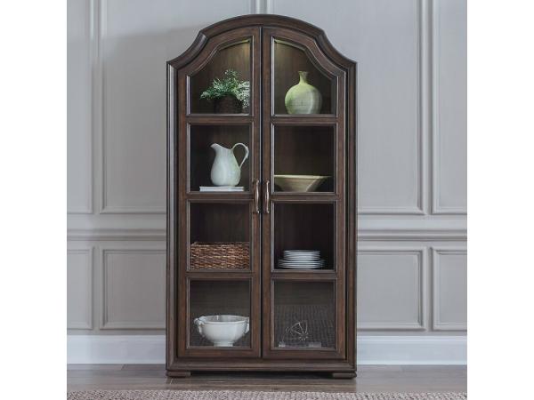 Showcase your cherished items in this elegant display cabinet, crafted from Rubberwood solids and Hickory veneers with a Chateau Brown finish. It features two glass doors, three adjustable shelves, and touch LED lighting to beautifully illuminate your col