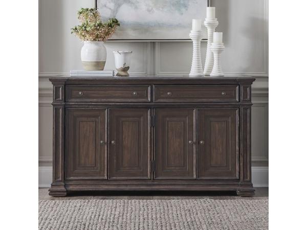 This elegant dining buffet is crafted with a serpentine-shaped top featuring three blue stone inserts for a distinctive look. It offers ample storage with four doors, two felt-lined drawers, and a removable silverware tray.